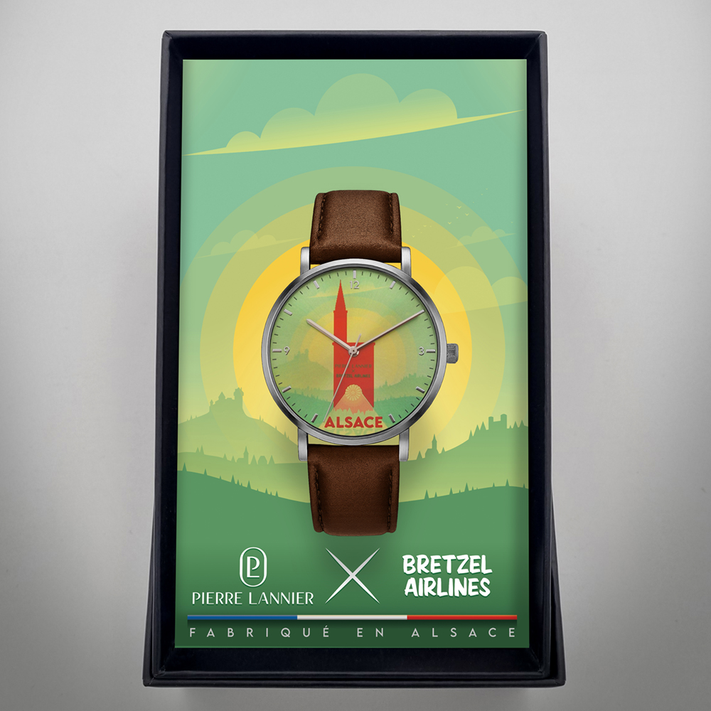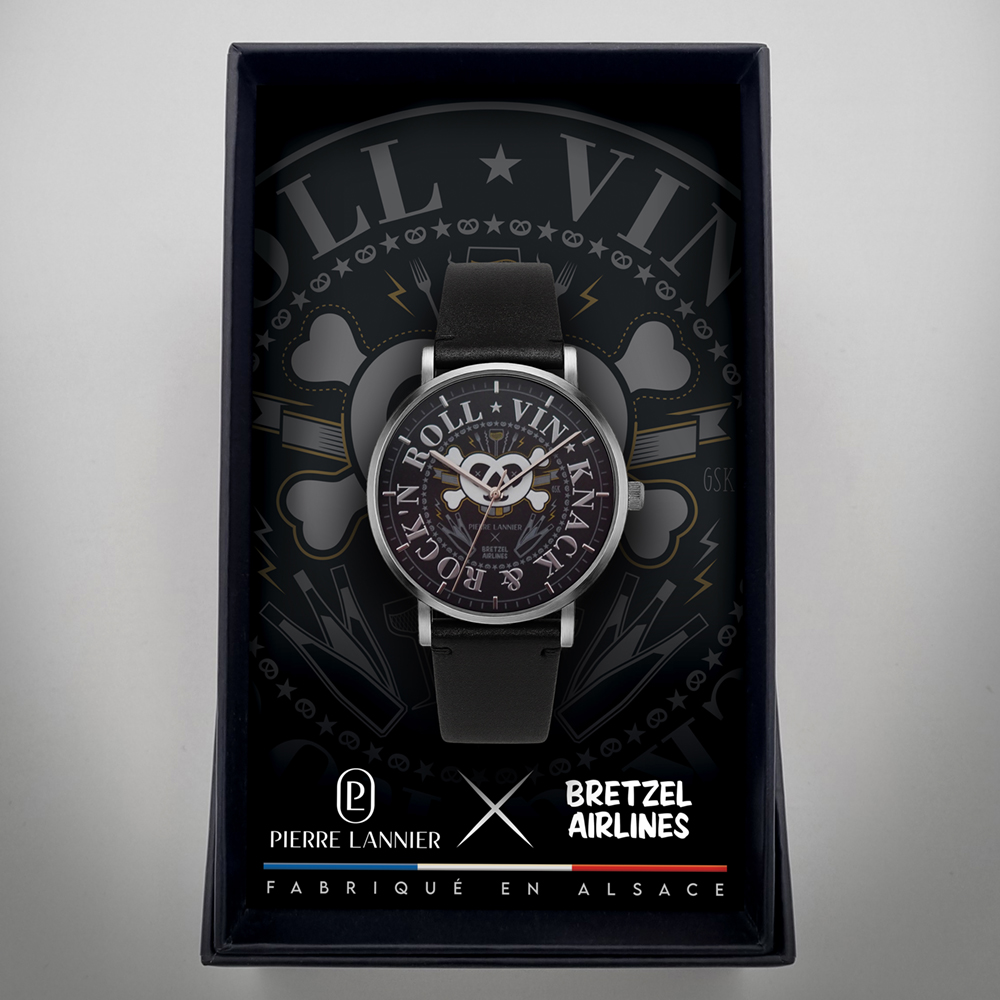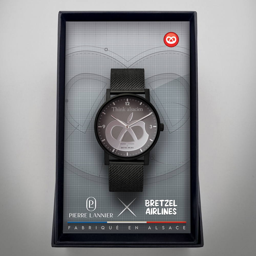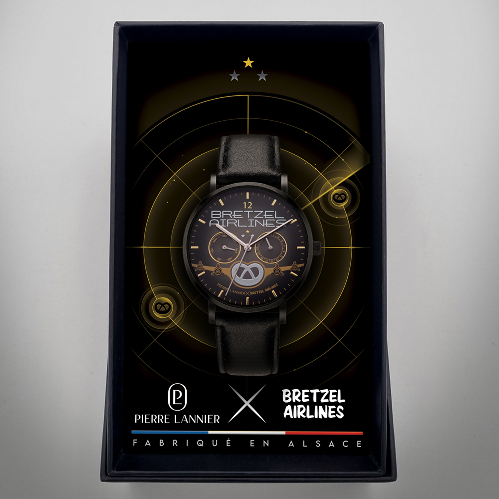 Entièrement dessinées par Bretzel Airlines, ces montres allient la modernité d’un design graphique et épuré à la finesse des détails chers à la marque. Chaque modèle traduit, à sa manière, l’attachement à la culture et à l’esprit de l’Alsace, entre humour, authenticité et élégance. Une collaboration 100 % alsacienne pour une collection de montres à l’image de la région. Fabriquées avec le savoir-faire horloger de Pierre Lannier, ces montres incarnent la rencontre parfaite entre créativité et l’artisanat locale.