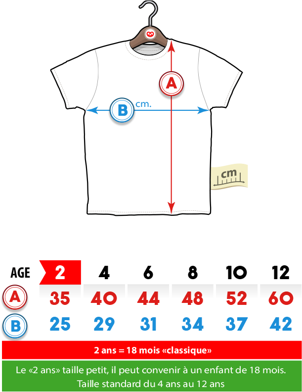 La plus petite taille "2ans" est volontairement petite (peut très bien convenir à un enfant de 12-18 mois) et permet ainsi de l'offrir en cadeau de naissance. Les autres tailles s'échelonnant du "4ans" au "12ans" sont des tailles tout à fait standard.